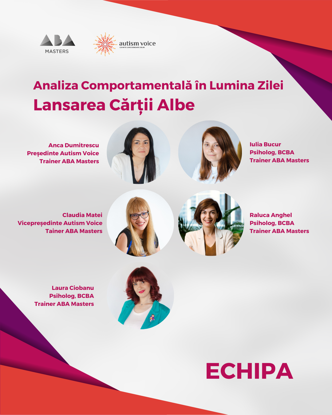 Pe 29 august, de la ora 19.00 pana la ora 20.00 – echipa Autism Voice & ABA Masters vă invită la lansarea Cărții Albe. Este a 3 a ediție pe care o traducem și ne bucurăm foarte mult că putem contribui astfel la educația specialiștilor din domeniul analizei comportamentale aplicate din România.